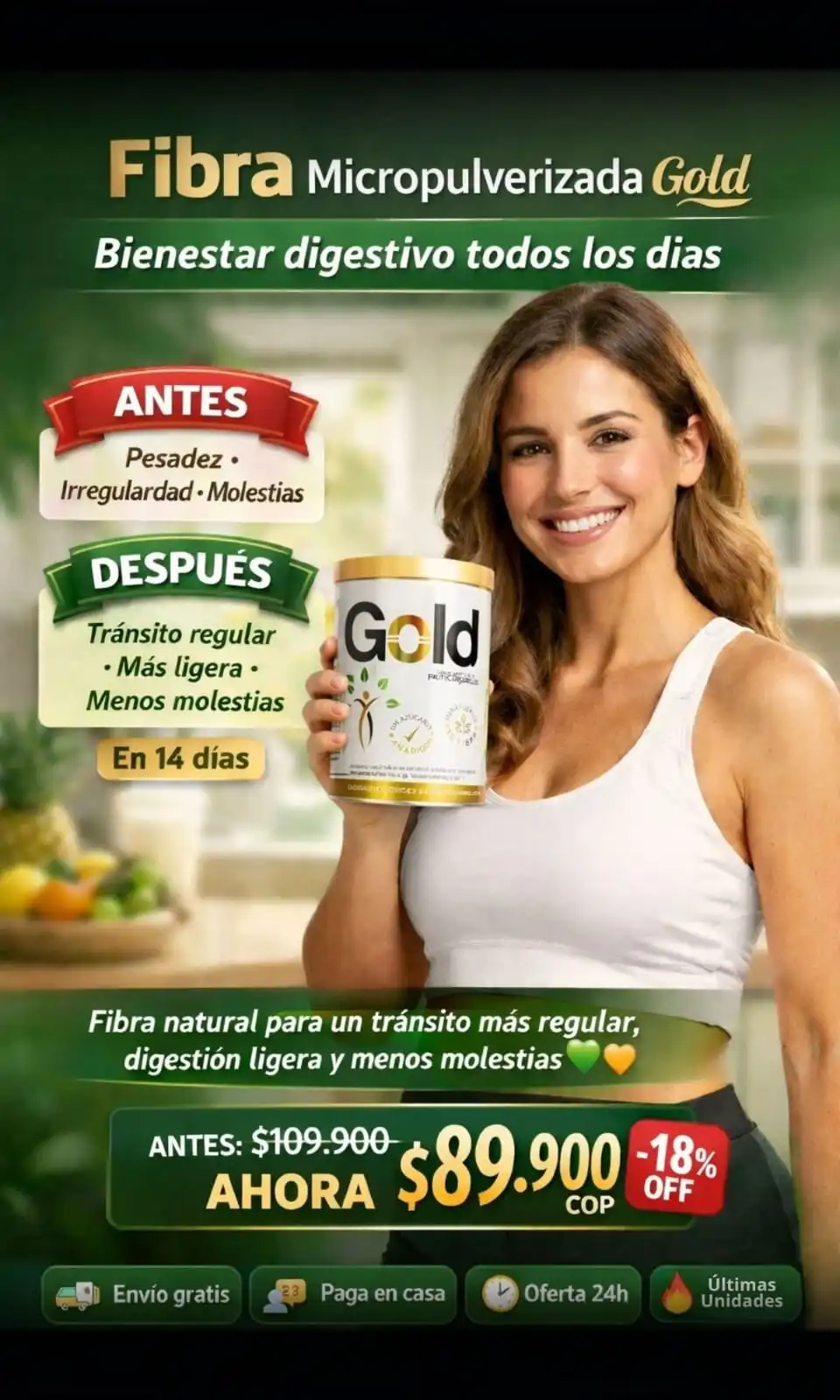 Nuestra fibra natural está diseñada para mejorar el tránsito intestinal, apoyar una digestión más ligera y ayudar a reducir la sensación de inflamación. Es ideal para mantener un equilibrio digestivo diario de forma natural 🌿
